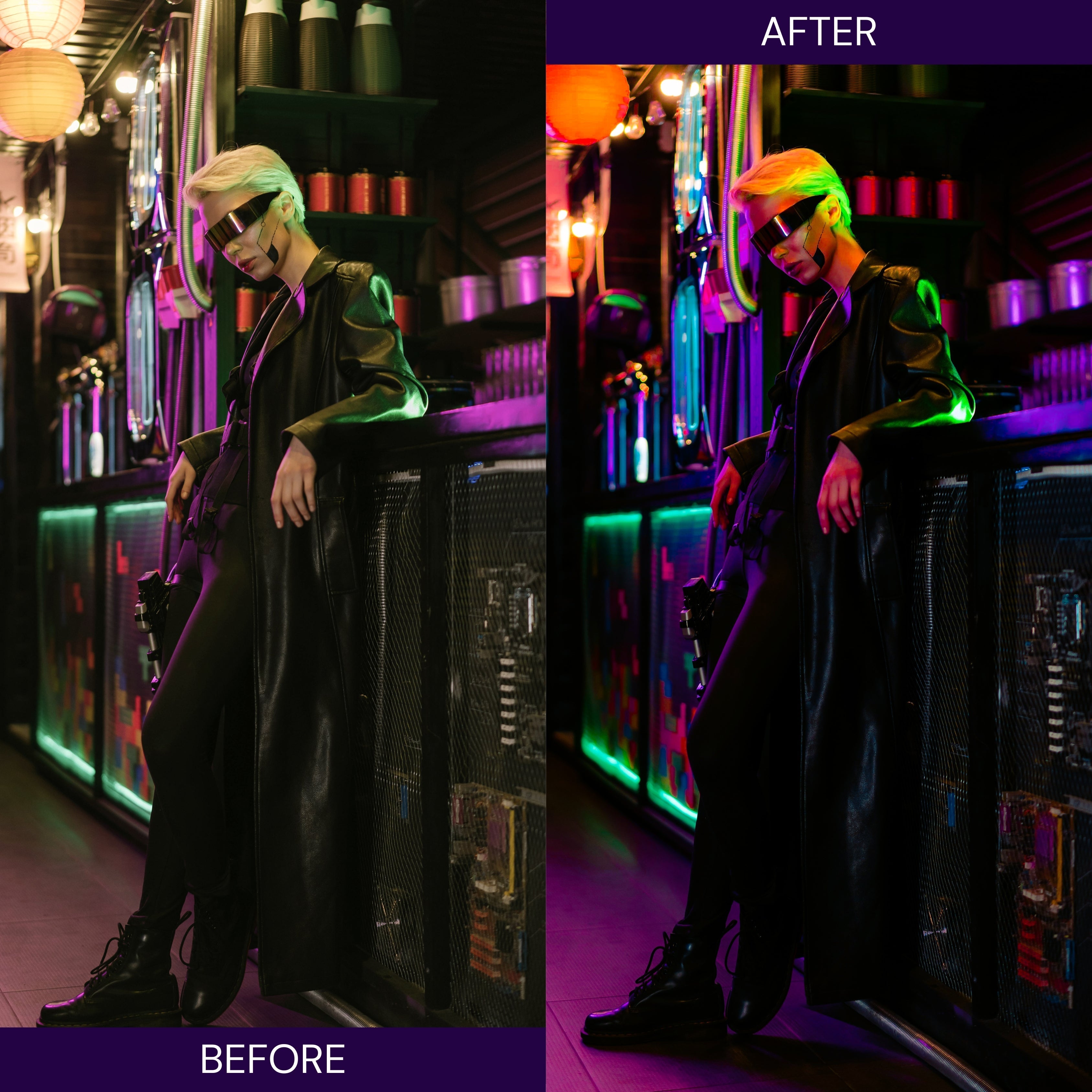 Step into a world of neon lights and futuristic landscapes with Adora’s Cyberpunk Lightroom Presets. Specifically designed for a cyberpunk aesthetic, these presets will elevate your photography to new heights, giving your images an edgy, vibrant, and otherworldly vibe. Whether you're capturing urban street scenes or experimenting with neon city photography, our presets will effortlessly turn your photos into captivating masterpieces that feel straight out of a science fiction world.